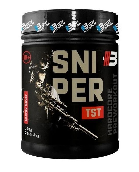 Najkomplexnejší viaczložkový predtréningový doplnok /preworkout/, ktorý obsahuje okrem bežných stimulačných látok navyše aj látky na zvýšenie hladiny vlastného testosterónu.Týmto zložením sa stáva SNIPER TST – TOP favoritom spomedzi všetkých predtréningových výrobkov. Obsahuje až 19 látok, ktoré sú určené predovšetkým na užítie pred výkonom. Skladba a množstvo jednotlivých látok je navrhnutá tak aby SNIPER TST bol pre každého športovca trefou do čierneho. Silné stimulačné účinku a nabudenie pred výkonom je len časť účinku tohto jedinečného nakopávača.Okrem nich pocítite maximálny nárast sily a výdrže trénovať vo vysokej intenzite počas celej tréningovej jednotky, alebo športového výkonu. SNIPER TST podporí napumpovanie svalstva, zlepší sústredenie /koncetráciu/, zvýši silu a silovú vytrvalosť. Synergia látok obsiahnutých v tomto prípravku dokáže posunúť vaše doterajšie limity a váš progres bude badateľný už po užití prvej dávky. Skvelá osviežujúca chuť energy, ktorá vás dokonale osvieži.