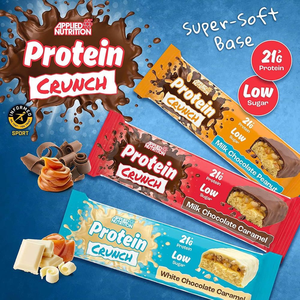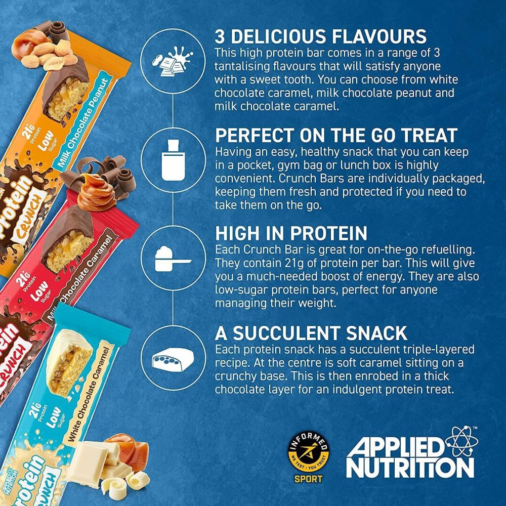 Applied Protein Crunch Bar je proteínová tyčinka určená ako výživný snack s vysokým obsahom bielkovín a nízkym obsahom cukru, ideálna po tréningu alebo ako zdravá desiata. Batonička obsahuje viac ako ~20 g bielkovín na porciu a je obalená v čokoládovej poleve s nízkym obsahom cukru a s mäkkým karamelovým streedom. Produkt je vhodný aj pre vegetariánov a je dostupný v rôznych príchutiach ako napr. Milk Chocolate Caramel, White Chocolate Caramel či Milk Chocolate Peanut.