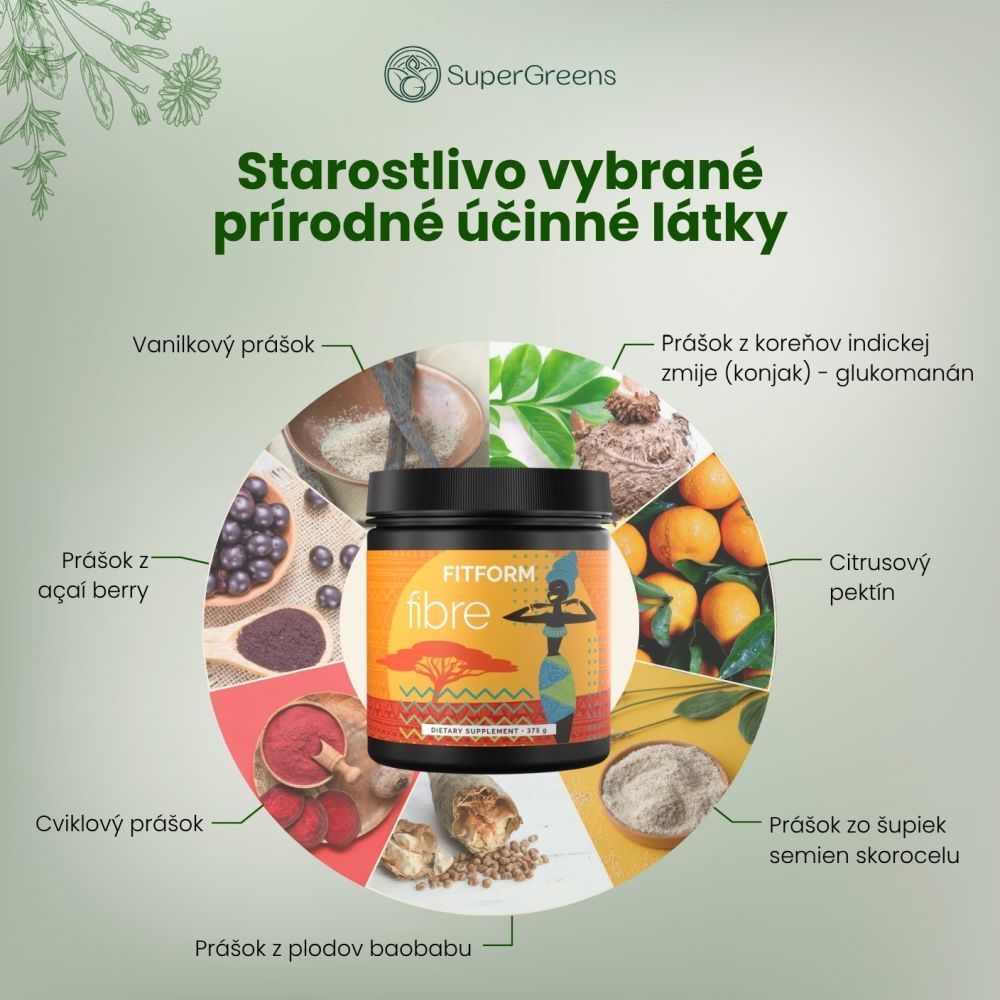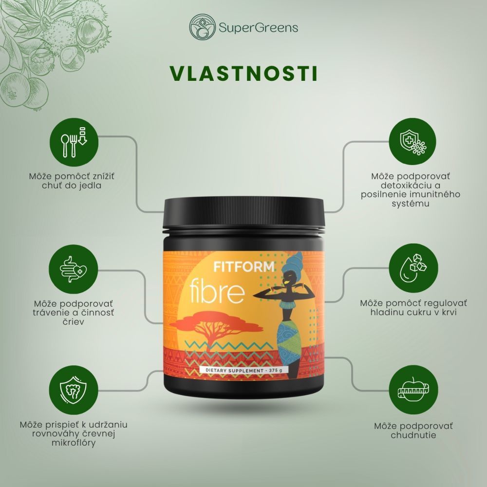 FitForm Fibre je vysoko kvalitný vlákninový prípravok s ovocnou príchuťou a bohatým obsahom antioxidantov, ktorý bol vyvinutý špeciálne na podporu trávenia a uľahčenie chudnutia. Výživový doplnok FitForm Fibre obsahuje dve hlavné zložkové komplexy: